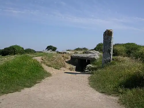 Am Eingang des Bauwerks steht ein so genannter Menhir indicateur, bei dem es sich um einen eher untypischen, bei der Restaurierungskampagne von 1931 aufgerichteten Stein mit abgeflachter Spitze und z. T. rechtwinkligen Kanten handelt. Wie auf alten Fotografien zu sehen ist, lag der Stein unmittelbar vor dem Eingang des Bauwerks. Ob dieser Stein mit seiner ungewöhnlichen Form jemals aufrecht gestanden und eventuell als Landmarke für die Seefahrer prähistorischer Zeiten gedient hat, ist unklar.