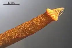 Die Sporenkapsel auf der etwa 10 Millimeter langen Seta ist zylindrisch, gerade oder gekrümmt und aufrecht bis leicht geneigt. Der Kapseldeckel ist spitz kegelig, die Haube kappenförmig. Die fein krenulierten Sporen haben eine Größe von 12 bis 16 Mikrometer. Sporenreifezeit ist im Mai und Juni. Die Art fruchtet gewöhnlich sehr reichlich.