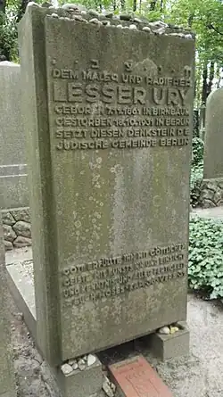 Die Beisetzung Urys fand am 21. Oktober 1931 statt; die Grabrede hielt sein langjähriger Freund, der Rabbiner Joseph Lehmann. Das Ehrengrab von Lesser Ury befindet sich im Feld G 1, Ehrenreihe auf dem Jüdischen Friedhof Berlin-Weißensee. Im Berliner Ortsteil Moabit wurde 1979 eine Straße nach ihm benannt (Lesser-Ury-Weg).[3]