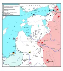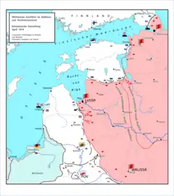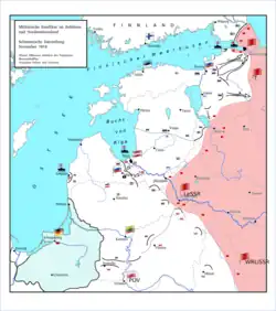 - Für die deutsche Regierung der Volksbeauftragten hatte das Baltikum zunächst keine besondere Bedeutung. Die deutsch-baltische Minderheit war zu unbedeutend. Um Ostpreußen vor der sowjetischen Armee zu schützen, wurden ab Dezember 1918 freiwillige Truppen angeworben.[6] Allerdings wurde von den maßgebenden deutschen Vertretern im Baltikum eine eigenständige Politik betrieben. Diese hatte hauptsächlich eine Abmilderung der Kriegsniederlage durch die Erringung einer militärischen Machtstellung zum Ziel und führte zu einem zunehmenden Gegensatz mit der eigenen Regierung.[7]