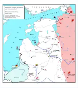 Die sowjetischen Verbände wurden Anfang Januar 1919 als besondere Armee der Lettischen SSR unter dem Befehl von Pēteris Avens gegliedert. Diese Armee bestand Ende Januar aus der 1. lettischen Division, der Internationalen Division und der Nowgoroder Division und kam durch Zwangsaushebungen auf eine Stärke von etwa 20.000 Mann.[10] Nach der Niederschlagung des Spartakus-Aufstands in Deutschland und Konsolidierung der gegnerischen Abwehr wurde ein Vorstoß nach Ostpreußen zur Ausweitung der Weltrevolution jedoch zunehmend utopisch. Im Februar 1919 wurde der Schwerpunkt der sowjetischen Angriffe nach Estland verlegt, um nach Ausschaltung dieser Flankenbedrohung weiter nach Westen vorzurücken. Gleichzeitig verlor der baltische Kriegsschauplatz durch die beginnenden Offensiven Koltschaks in Sibirien und die Intervention Frankreichs in der Ukraine für die sowjetrussische Führung an Bedeutung.
