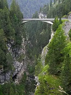 Die Letziwaldbrücke (auch: Lezibrücke[1]) ist eine Bogenbrücke aus Stahlbeton in Avers, Kanton Graubünden. Die Strassenbrücke überspannt mit einem sehr flachen, 66,5 Meter[2] weit gespannten Bogen[3] die Schlucht des Averser Rheins, in den ca. 600 Meter westlich der Madrischer Rhein mündet. Sie wurde von Christian Menn entworfen und 1959 gebaut. Das Tragwerk gleicht der Vorderrheinbrücke in Tavanasa, die Robert Maillart 1905 projektierte.[4] Die Letziwaldbrücke gehört mit 85 Metern[4] Höhe über Talgrund zu den höchsten Brücken der Schweiz.