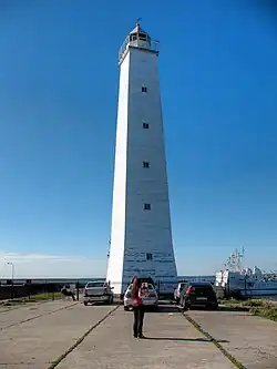 Unterfeuer, zylindrischer Turm mit Galerie; Der weiße Turm hat seitliche, rote Ausleger als Tagesmarke. Dies ist der Hauptansatzbereich für Lomonossow. Die Bake steht in der Nähe der Basis des östlichen Wellenbrechermole des Hafens von Lomonossow. Zugänglich, Turm geschlossen.[13][14] | |