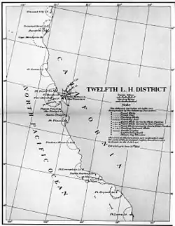 Am 1. Juli 1939 unterstellte Franklin D. Roosevelt die Leuchttürme in den Vereinigten Staaten der United States Coast Guard.[20] Als Grund für diese Maßnahme gab Roosevelt die Verbesserung der Effizienz und der Wirtschaftlichkeit an, verschiedentlich wird jedoch vermutet, dass Roosevelt am Vorabend des Zweiten Weltkrieges auch aus strategischen Gründen eine Verwaltung der Leuchttürme durch eine militärische Institution bevorzugte.[21] Am Abend nach dem japanischen Angriff auf Pearl Harbor vom 7. Dezember 1941 wurden die Leuchttürme an beiden amerikanischen Küsten dann abgedunkelt oder gänzlich abgeschaltet.[22] Als im Jahr 1942 zweimal deutsche Saboteure an den Stränden der amerikanischen Ostküste aufgegriffen wurden, verstärkte sich die Furcht, die Japaner könnten an der Westküste ebenfalls Sabotageeinheiten anlanden. Aus diesem Grund blieben kalifornische Leuchttürme wie Point Bonita Light und Point Loma Light, die sich in unmittelbarer Nähe von Geschützstellungen befanden, während des Krieges dauerhaft außer Betrieb. Gleichzeitig patrouillierten insgesamt 24.000 Männer der Coast Guard Beach Patrol mit 2.000 Hunden die Strände der Vereinigten Staaten.[23] In Kalifornien – wie auch in anderen Staaten der Pazifikküste – waren Teile dieser Mannschaften für die Zeit ihres Dienstes in den Leuchtturmanlagen untergebracht.