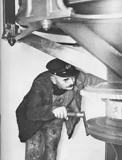 Üblicherweise waren Leuchtturmanlagen in Kalifornien mit zumindest zwei Wärtern besetzt, einem Hauptleuchtturmwärter (engl. head keeper) und einem Hilfsleuchtturmwärter (engl. assistant keeper). Deren Arbeitstag war in den gedruckten Instructions to Light-Keepers festgelegt[26] und bestand nachts aus zwei Schichten. Der Hilfsleuchtturmwärter übernahm zumeist die erste Schicht, die von Sonnenuntergang bis etwa Mitternacht dauerte.[27] Zuerst musste die Fresnel-Linse gesäubert und die Lampe mit Öl gefüllt werden. Dabei wurde auch der Docht (engl. wick) gekürzt oder gegen einen neuen ersetzt (mit Bezug auf diese Tätigkeit bezeichneten die Leuchtturmwärter sich häufig scherzhaft selbst als ‚wickies‘[28]). Dann wurde der uhrwerkartige Mechanismus aufgezogen, der die Linse auf ihrer horizontalen Achse bewegte. Dies bedeutete bei einigen Anlagen in Kalifornien ein zwanzigminütiges kraftintensives Drehen der Kurbel (Bild).[29] War der Leuchtturm auf diese Weise für die Nacht präpariert, zündete der Wärter die Lampe an und zog sich für den Rest seiner Schicht in den watchroom zurück, der üblicherweise direkt unter dem Laternenraum liegt. Um Mitternacht trat dann der Hauptleuchtturmwärter seine Schicht an. Diese endete am Morgen damit, dass die Kupfer- und Messingteile der Optik poliert wurden und die Anlage von Staub befreit wurde. Bei ihren Reinigungsarbeiten trugen die Leuchtturmwärter spezielle Leinenschürzen, um auf diese Weise ein Verkratzen der wertvollen Glasprismen der Linse zu verhindern. Sobald die Putz- und Polierarbeiten abgeschlossen waren, zog der Leuchtturmwärter einen Vorhang zu, der die Optik während des Tages vor Sonnenstrahlen schützte.