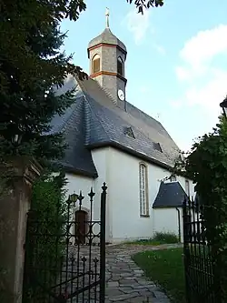 - Es hat 115 Häuser, 580 Einwohner, eine Tochterkirche von Neukirchen, 2 Mühlen, 14 Magazinhufen, und unter den Einwohnern viele Factore, Strumpfwirker und Leinweber, die viele Zelter- und Kittelleinwand weben. Hier ist auch ein Lehngericht, das mit den Obergerichten nach Grünhain gehört, seine eigenen Untergerichte und manche Vorreichte, auch 20 auf dessen Grund und Boden erbauete Häuser hat. Ein anderer Antheil von Leuckersdorf, mit 70 Einwohnern gehört auch unmittelbar unter das Amt Grünhain.