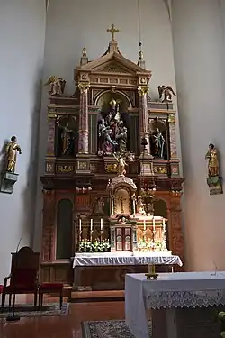 1901 erfolgte die Gründung eines Kirchenbauvereins zum Umbau und zur Vergrößerung der zu klein gewordenen Pfarrkirche. Der Grundstein zur neuen Kirche wurde am 17. Mai 1908 gelegt; am 29. April 1911 wurde die Konsekration der neuen Pfarrkirche vorgenommen. Die Wappen im Glasfenster nahe dem Hochaltar erinnern an die kräftige Unterstützung des Neubaus durch die damaligen Besitzer von Schloss Trautenburg, das Ehepaar Rüdiger Seutter von Loetzen und Anna, geb. Marchesa Tacoli dei Marchesi di San Possidonio.[6]