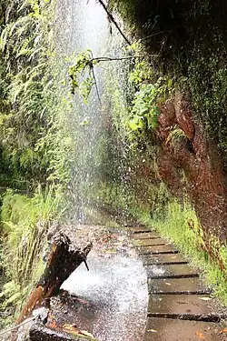 Eine längere Passage wird an einer steil abfallenden Felswand entlanggeführt, vor der sich kleine Wasserfälle in den Kanal stürzen. Immergrüne Vegetation mit rankenden Farnen geben dem Quellfluss der Levada, dem Ribeiro Bonito (portugiesisch für Schöner Fluss), einen wildromantischen Anstrich.
