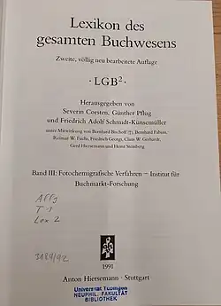 - Lexikon des gesamten Buchwesens. Zweite, völlig neu bearbeitete Auflage, 9 Bände, Hiersemann, Stuttgart 1987–2016, ISBN 978-3-7772-8527-6.