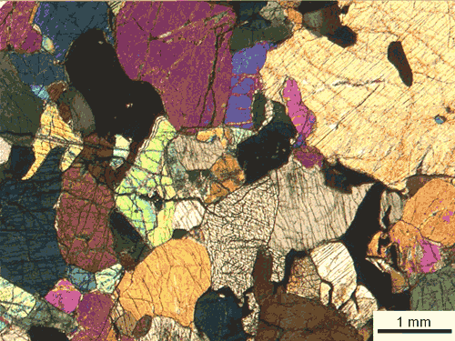 Ungleichkörniger Lherzolith von mittelkörniger Korngröße (Durchmesser 1 – 3 Millimeter). Gut erkennbar im Dünnschliff die Hauptkomponenten Olivin, Klinopyroxen, Orthopyroxen und Spinell. Die Olivine unterscheiden sich von den Pyroxenen durch ihre deutlicheren und unregelmäßigeren Spaltrisse. Olivine und Pyroxene befinden sich in einem perfekten Gleichgewichtszustand, erkennbar an den Tripelpunkten, an denen die Kristalle unter einem Winkel von 120° aufeinandertreffen. Spinell (dunkelbraun, isotrop unter gekreuzten Polarisatoren) tritt interstitiell auf.