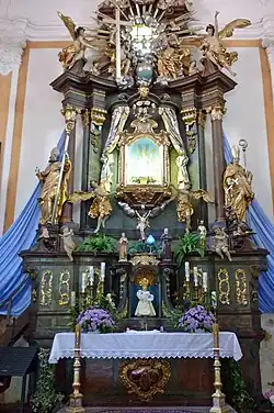 Der Hochaltar steht im gotischen Kirchenschiff und stammt wie die anderen Altäre und die Kanzel aus der Barockzeit, der Zeit nach dem großen Brande, und wurde 1744 errichtet. Es ist eine einfache Schnitzarbeit. Das Altarbild, das den Kirchenpatron St. Martin bei der Mantelteilung darstellt, wurde vom Bruder des damaligen Patronatsherren, dem Freiherrn August Zeßner von Spitzenberg, gemalt und 1872 der Kirche gestiftet. Die mit Schnitzwerk und den Büsten der vier Evangelisten gezierte Kanzel ist im Jahr 1744 errichtet worden. Im Südflügel gegenüber dem Haupteingang befindet sich der Marienaltar mit dem Gnadenbild, rechts neben dem Altar führt eine Tür in die mit einem Rundbogen überwölbte Gruftkapelle.