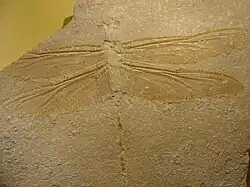 Aus dem oberen Karbon sind verschiedene Libellenvorfahren bekannt. Diese Tiere werden als Meganisoptera bezeichnet und umfassen als bekannteste Vertreter die Riesenlibellen (Fam. Meganeuridae) Meganeura monyi mit bis zu 70 und Meganeuropsis permiana mit bis zu 72 Zentimetern Flügelspannweite. Aus derselben Zeit sind noch urtümlichere Libellen überliefert (z. B. aus der Fundstelle in der Ziegeleigrube Vorhalle in Hagen), die in eine eigene Ordnung Geroptera gestellt werden, sie wiesen ein rudimentäres drittes Flügelpaar am Prothorax auf.[5][6] Zu den altertümlichen, plesiomorphen Merkmalen dieser Ordnungen zählen: Hinterleibsende mit Terminalfilum und Cerci (wie bei den modernen Eintagsfliegen), paariger Penis (ebenso). Wahrscheinlich setzten die Tiere noch freie Spermatophoren ab wie die rezenten „Urinsekten“ (Fischchen und Felsenspringer). Gleichzeitig lebten auch bereits anatomisch modernere, kleinere Tiere, die näher mit den modernen Libellen verwandt sind.[7]