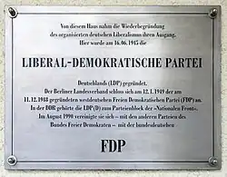 Nachdem dieser Vorstoß an unterschiedlichen Auffassungen zur Trennung von Politik und Religion gescheitert war, trat die neue Partei unter dem Namen Liberal-Demokratische Partei Deutschlands (LDP) am 5. Juli mit ihrem Gründungsaufruf an die Öffentlichkeit.[3] Sie wandte sich vor allem an ehemalige Mitglieder von der DDP, der DVP und des gemäßigten DNVP-Flügels in der Weimarer Republik. Im Gegensatz zur CDU sprach sie sich entschieden für den Erhalt des Privateigentums und gegen Verstaatlichung von Bodenschätzen und staatliche Kontrolle des Bergbaus und der wichtigsten Industriezweige aus.