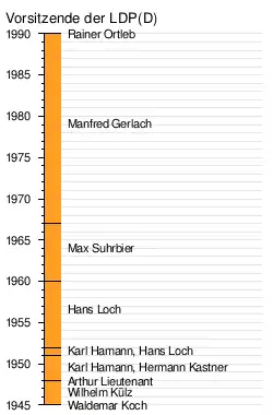 | Parteivorsitzender | Waldemar Koch (1945) Wilhelm Külz (1945–1948) Arthur Lieutenant (1948) Karl Hamann (1948–1952) Hermann Kastner (1949–1950) Hans Loch (1951–1960) Max Suhrbier (1960–1967) Manfred Gerlach (1967–1990) Rainer Ortleb (1990) |
