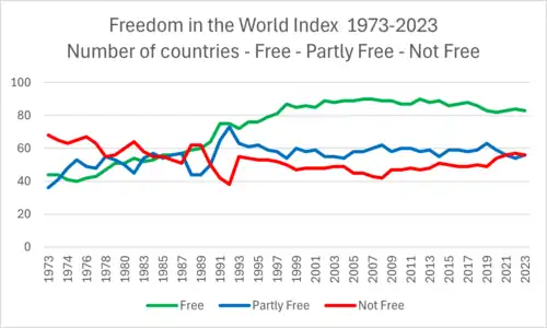 Zu Beginn der Demokratiebewertung der Länder durch Freedom House, Anfang der 1970er Jahre, überwog der Anteil autokratischer Staaten die der liberalen Staaten. Die folgenden, bis in die 1990er Jahre waren geprägt von einem globalen Trend hin zu mehr Demokratie. Der Zusammenbruch der Sowjetunion und das Ende des Kalten Krieges schufen ein günstiges internationales Klima für demokratische Bewegungen in Europa und ermöglichten vielen Ländern demokratische Strukturen zu etablieren, wie in Polen, Tschechoslowakei, Ungarn, in der DDR zur Wiedervereinigung mit der Bundesrepublik Deutschland, die Balkanstaaten, Slowenien und Kroatien, die Baltischen Staaten, Estland, Lettland und Litauen, in Lateinamerika, Chile und Argentinien.