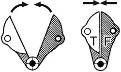 Die Libertypresse ist eine fuß- oder motorbetriebene Tiegeldruckpresse. Der Druck-Tiegel (T) und das Fundament (F) mit der Druckform schwingen bei diesen Maschinen um eine gemeinsame Achse. Im Moment der Papieranlage sind sie aufgeklappt wie die Hälften eines geöffneten Buches, den Druckpunkt findet man in senkrechter Position.