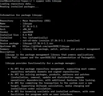 Zur libzypp gehört das Kommandozeilen-Interface zypper, das auch über eine eigene Eingabeaufforderung verfügt. Zypper unterstützt YaST2 und RPM MetaData als Repository-Format. Die installierten Repositories in zypper sind synchron mit denen in YaST2, da YaST selbst auch auf die libzypp als Paketverwaltungsengine setzt. Zypper unterstützt alle gängigen Paketverwaltungs-Funktionen, wie das Auflösen von Abhängigkeiten, das Installieren und Entfernen von Paketen und die Aktualisierungsverwaltung, also das Suchen nach Patches und Updates. Als grafische Oberfläche für Zypper kann YaST betrachtet werden, da sowohl YaST als auch Zypper auf die libzypp-Engine zurückgreifen.