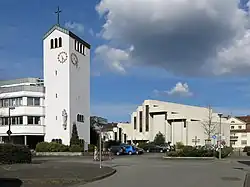 Die alte Kirche wurde nach Plänen von Winfried Karbe durch ein neues Kirchengebäude und ein mehrstöckiges Haus ersetzt, das auch Nutzungen außerhalb des Gemeindelebens möglich machte. Das Kirchengebäude steht auf einem Grundriss, in Form eines Trapezes, mit Eckabschrägungen. Über diesem Grundriss sind schräge Unterzüge gespannt, die insgesamt acht Abschnitte ergeben. Diese einzelnen Schotten sind durch hohe Glasbahnen und geschlossenen Wandabschnitte begrenzt; sie betonen den trapezförmigen Grundriss mit Vor- und Rücksprüngen.