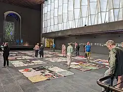 Die Besonderheit des Ortes liegt auch in der Wirkung des Gebäudes und seiner künstlerischen Ausstattung. Kunst und Architektur des doppelgeschossigen Kirchbaus aus Stahlbeton gelten als herausragendes Beispiel der Nachkriegsmoderne. Die Bauteile des Gebäudes sind in verschieden großen Rechtkantformen ausgebildet – also der Hauptbaukörper mit Hochschiff und Seitenschiffen, der hohe Altarraum und der Fassadenturm mit Haupteingängen und Glockengeschoss.[10] Es wurden unterschiedliche Baumaterialien verwendet: Beton, Naturstein, Holz, Glas/Dickglas und Kunststoff. Im Foyer, Treppenaufgang und Altarraum beeindrucken große Flächen aus Sichtbeton.[11] Durchscheinende Faltwerkwände aus glasfaserverstärktem Plexiglas – einzigartig in Konstruktion und Größe – tauchen die Halle je nach Tageszeit und Wetterlage in unterschiedliches Licht.[12]