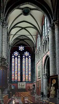 Die Fenster des Chors und des Umgangs in Form von Spitzbogenfenstern und dreiteiligen Fenstern mit Stabwerk, typisch für die Scheldegotik. Ein runder Treppenturm ist im Winkel des südlichen Querschiffs und des Chorumgangs angeordnet, der zum Triforium führt und über das Triforium mit dem benachbarten Treppenturm in der Südostecke des Querschiffsarms verbunden ist, der auf der Höhe des Gesimses des Chorumgangs beginnt und zum äußeren Laufgang und zu den Dachböden führt.