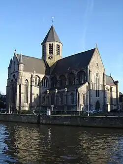Die ältesten Teile der Kirche bestehen aus Tournai-Kalkstein und Bruchstein, die Teile aus dem 16. Jahrhundert aus Back- und Sandstein. Die Kirche ist ganz im Stil der Tournaier oder Scheldegotik gebaut und kann als ein charakteristisches Werk dieses Stils gelten. Der Bau begann 1234 an der Ostseite mit Chor, Umgang und Vierungspfeilern unter der Leitung des ältesten namentlich genannten Baumeisters Flanderns, Arnold van Binche (Gedenkstein in der Chorwand, 1835 hinter einer Bronzekopie verborgen). Kurz darauf wurden Turm und Querschiff errichtet; das Kirchenschiff wurde wahrscheinlich Ende des 13. Jahrhunderts gebaut. Ende des 13. und Anfang des 14. Jahrhunderts wurde das nördliche Querschiff umgebaut und die Fenster vergrößert. Die Gewölbe des Kirchenschiffs und des Querschiffs stammen aus der Zeit 1502 bis 1516. In den Jahren 1523 bis 1530 wurde das südliche Kirchenschiff abgerissen und ein neues mit spätgotischen Seitenkapellen aus Balegem-Sandstein erbaut; außerdem wurde eine kleine Sakristei im südlichen Seitenschiff des Querschiffs angebaut. 1561 erfolgte der Anbau eines Renaissance-Portals an den nördlichen Querschiffsarm.