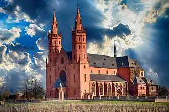 - ↑ Bei der Theorie, dass die Kirche im Westen begonnen und sich der Baufortschritt nach Osten entwickelt habe (so etwa Glatz (1), S. 376f), ergeben sich Probleme, die vermieden werden, wenn die neueren Annahmen von Decker, Keddigkeit, Schöbel (S. 882) zugrunde gelegt werden. Allerdings wird die gegenteilige Theorie weiter vertreten (vgl. Spille: Liebfrauenkirche Worms. S. 10).