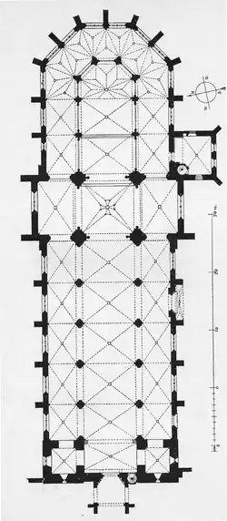 Schon in den 1270er Jahren war der Neubau der heute noch stehenden Kirche in einem fortgeschrittenen Stadium.[8] Zunächst wurden die östlichen Teile erstellt, die 1298, bei der Erhebung zum Stift, schon genutzt werden konnten.[9][Anm. 1]