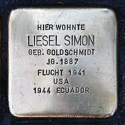 Liesel Simon, geb. Goldschmidt, stammte aus Neumarkt in der Oberpfalz. Sie war das jüngste von zehn Kindern des Herd-, später Fahrradfabrikanten Joseph Goldschmidt und seiner Frau Julie. Im Jahr 1919 heiratete sie den Kaufmann Paul Jacob Simon, dessen Familie in der Frankfurter Altstadt ein Geschäft für Spazierstöcke, Schirme, Naturrohr, Tee und Lacke führte. In den Jahren 1911 und 1913 kamen die beiden Söhne Hans und Fritz zur Welt.[1]