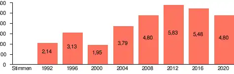 | Jahr | Stimmenanteil (%) | Platzierung | Sitze | Platzierung | Regierungsbeteiligung |