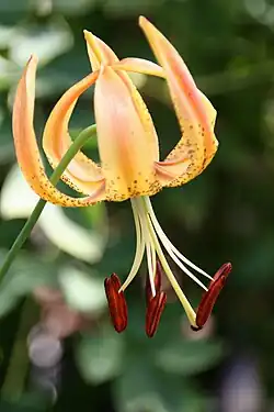 Die Blüte ist orange bis gelb-orange, dunkelrot gepunktet und türkenbundförmig. Der Samen keimt verzögert-epigäisch, vegetativ vermehrt sich die Pflanze durch ihr Rhizom.