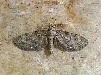 Die Flügelspannweite der Falter beträgt 18 bis 24 Millimeter.[2] Die Grundfarbe sämtlicher Flügel variiert von hellgrau bis zu hell braungrau. Frisch geschlüpfte Exemplare zeigen einen seidigen Glanz. Arttypisch sind die doppelten Querlinien, die die Diskalregion auf der Vorderflügeloberseite beidseitig begrenzen. Ein länglicher schwarzer Diskoidalfleck hebt sich nur undeutlich ab. Die Postdiskalregion ist als grauweiße Binde ausgebildet. Die Wellenlinie ist weiß, die Fransen sind grau und nicht gescheckt.