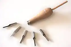 Schneidewerkzeug: Als Werkzeuge dienen verschiedene Schneideklingen: ein Konturmesser, ein Geißfuß (v-förmige Klinge) und drei Hohleisen (Rundmesser, u-förmige, 2, 3 oder 4 mm breite Klinge). Als Halterung dient ein Schraubhalter oder ein birnenförmiges Holzheft mit Ausstoßer. Im einfachsten Fall lässt sich ein gewöhnliches Taschenmesser verwenden.[6]