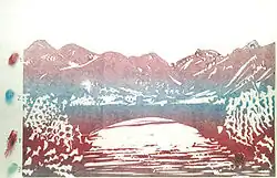 Farbiger Einplattendruck. Harvard: Norwegische Landschaft, 2006Einplattendruck: Der Abdruck von einer einzelnen Druckplatte ist meist monochrom (Einfarbendruck). Am häufigsten ist der Schwarzdruck, bei dem die Platte schwarz eingefärbt und auf weißem Papier abgedruckt wird. Beim Weißdruck wird die Druckplatte mit weißer Farbe eingestrichen und auf schwarzem Papier abgezogen. Ein Mehrfarbendruck entsteht, wenn manuell einzelne Partien mit Pinseln, Tupfern oder Schablonen mit mehreren Farben eingefärbt werden.[12]