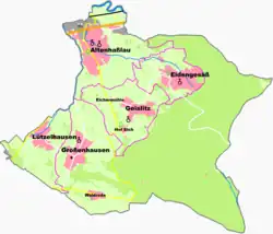 Für alle Ortsteilebesteht je ein Ortsbezirk mit Ortsbeirat und Ortsvorsteher nach Maßgabe der §§ 81 und 82 HGO und des Kommunalwahlgesetzes in der jeweils gültigen Fassung.[23] Die Ortsbezirke sind durch die Gebiete der der ehemaligen Gemeinden abgegrenzt. Jeder Ortsbeirat bestehen aus acht Mitgliedern. Deren Wahl erfolgt im Rahmen der Kommunalwahlen. Der Ortsbeirat wählt eines seiner Mitglieder zum Ortsvorsteher bzw. zur Ortsvorsteherin. Zur Zusammensetzung siehe die jeweiligen Ortsteile.