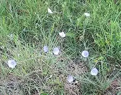 Die zwittrige Blüte ist radiärsymmetrisch, besitzt eine doppelte Blütenhülle und einen Durchmesser von 2 bis 3 Zentimetern. Die Kelchblätter sind bei einer Länge von 10 bis 12 Millimetern breit-eilanzettlich mit lang zugespitztem oberen Ende und mit breitem Hautrand.[1] Die Kronblätter sind hell- bis dunkelblau, selten weißlich. Sie fallen am Nachmittag ab. Die Staubblätter sind etwa 14 bis 15 Millimeter lang und am Grund zu einer kurzen Röhre verwachsen.[1] Der Griffel ist etwa 5 Millimeter lang und endet in einer linealischen Narbe.[1]