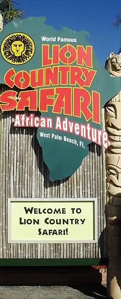 Die Lion Country Safari wurde im Sommer 1967 in einem parkartigen Gebiet im Westen des Palm Beach County mit Dutzenden von frei gehaltenen Löwen (Panthera leo) und einigen anderen Tierarten eröffnet. Es handelte sich dabei um den ersten käfigfreien Zoo in den Vereinigten Staaten. Die Anlage im Palm Beach County in Südflorida erwies sich aufgrund des ganzjährig tropischen Klimas, einer wachsenden Bevölkerung und Touristen, die aus aller Welt die Gegend besuchen, als idealer Standort.[1] 2012 gab es auf dem Parkgelände einige Überschwemmungen, die durch Hurrikan Isaac verursacht wurden. Die Tiere nahmen keinen Schaden, es wurden während des Tropensturms sogar einige Antilopen geboren.[2]