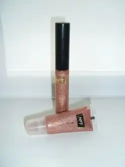 Als Lipgloss (auch Lip gloss, engl. für Lippenglanz)[1] bezeichnet man verflüssigte Make-up-Lippenfarbe. Diese ist oftmals transparent oder durchschimmernd, aber auch mit Glanz- oder Glitzereffekt erhältlich, und wird teils mit Pflegestoffen angereichert. Lipgloss wird von Kosmetikherstellern in diversen Ausführungen, Farben und Aromen angeboten. Jüngere Frauen ziehen Lipgloss oft dem Lippenstift vor, oder nutzen ihn als Einstiegsprodukt in die Kosmetikwelt, da er kulturell mit Jugendlichkeit und Sexualität assoziiert wird. Ältere Frauen tragen ihn gerne, da er kleine Lippenfältchen kaschiert. Im Gegensatz zum herkömmlichen Lippenstift enthält der Lipgloss mit etwa drei Prozent nur etwa ein Viertel der Farbpigmente[2] oder ist transparent.