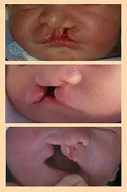 • Lippenspalte: (Cheiloschisis) Öffnung in der Oberlippe zwischen Mund und Nase. Der Spalt in der Oberlippe erstreckt sich vom Lippenrot bis zum Nasenloch. Die Trennstelle befindet sich entlang der Philtrum-Kante. Bei beidseitigen Spalten ist das zentrale Segment der Oberlippe isoliert.