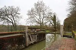 Die benachbarte Staustufe ist nicht historisch, sie wurde in den 1960er Jahren erbaut. Die Lippe wurde dafür komplett über die Schleusenstrecke umgeleitet, was der örtliche Kanuverein für Slalomveranstaltungen nutzte.[1] Der ursprüngliche Lippestau lag zwischen Schleuse und Schloss.