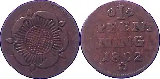 | 1812 bis 1825 | Jobst Henrich Trebbe | * 28. Jan 1807 in Lemgo;[17][18] Kupferschmied in Lemgo Münzmeisterzeichen: T |