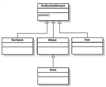 Dies führt zur Frage, was Vererbung über die Beziehung der Oberklasse zur Unterklasse aussagt. Diese Frage wird normalerweise beantwortet mit: Vererbung beschreibt eine ist-ein-Beziehung. Eine typische Hierarchie von Klassen in einem Grafikprogramm könnte z. B. aus einer Oberklasse GrafischesElement und davon abgeleiteten Unterklassen wie Rechteck, Ellipse oder Text bestehen. Beispielsweise wird man die Ableitung der Klasse Ellipse von der Klasse GrafischesElement begründen mit: Eine Ellipse ist ein grafisches Element. Die Klasse GrafischesElement kann dann beispielsweise eine allgemeine Methode zeichne definieren, die von Ellipse ersetzt wird durch eine Methode, die speziell eine Ellipse zeichnet.