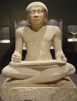 | Statue des Schreibers Heti | 5. Dynastie, um 2300 v. Chr. | Gizeh, Nekropole | Kalkstein | 52,1 × 37,3 × 26 cm | Hildesheim, Roemer- und Pelizaeus-Museum | PM 2407 | |