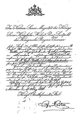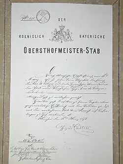 Verleihungsurkunde – Ignaz Magnus Mayer für den Hoftitel K.B. Sattler- und Wagenfabrikant vom 17. März 1888Parfümerie Brückner-Bublitz – Königlich bayerischer Hoflieferant seit 11. März 1905[6]