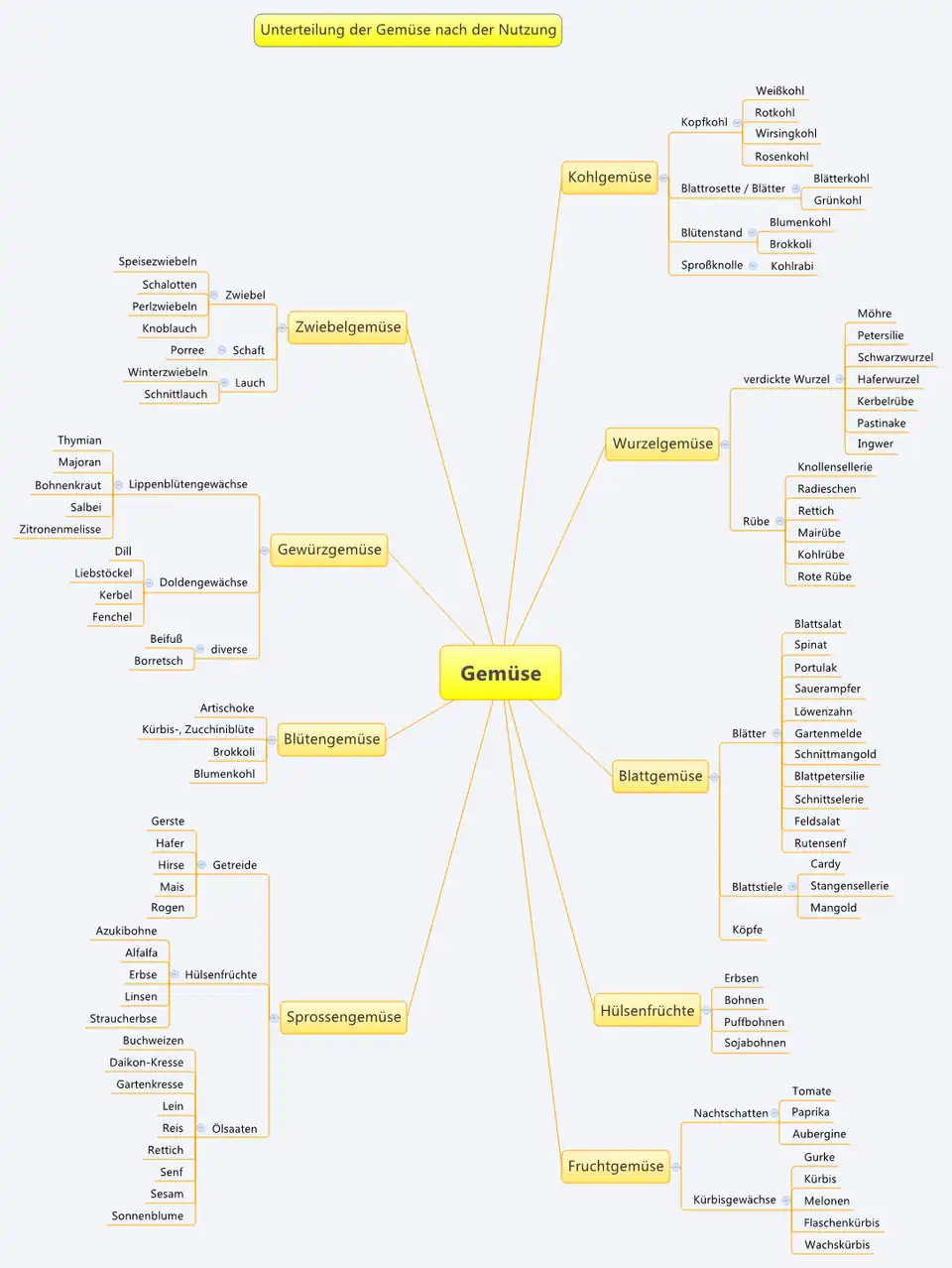 Siehe Schemabild rechts, in der Gemüse unterteilt nach ihrer Verwendung aufgelistet ist.