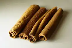 | Zimt (Cinnamomum verum J. S. Presl) | innere Rindenschicht; getrocknete Blüten | Braten, arabische Küche, Gebäck, Dessert, Milchreis, Obstzubereitungen, Reissalat, Rotkohl, Quark, Punsch, in Lebkuchengewürz | ![]() |