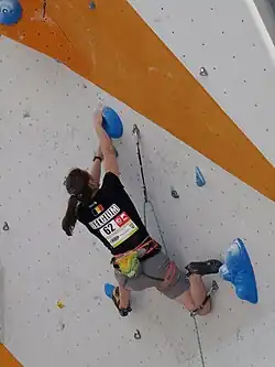 Klettern zu Demonstrationszwecken. Bei Wettkämpfen auf regionaler Ebene wird die Wettkampfroute manchmal vorgeklettert.