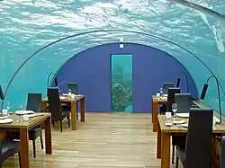 Ithaa (dhivehi für Mutter der Perle) ist das weltweit einzige vollverglaste Unterwasser-Restaurant und befindet sich im Hotel Conrad Maldives Rangali Island.[32] Es ist erreichbar über einen Korridor von der Wasseroberfläche, so dass Besucher die Anlage trockenen Fußes und ohne die Notwendigkeit von langwierigen Kompressions- bzw. Dekompressionsprozeduren betreten und verlassen können. Ithaa wurde von M.J. Murphy Ltd. gebaut und hat ein Gewicht von 175 t.[33] | |