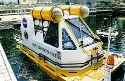 Hydrolab bestand aus einem Zylinder mit den Dimensionen 5,49 m × 2,44 m. Es verfügte über eine Eingangsschleuse, so dass die Dekompression am Ende einer Mission innerhalb des Habitats und unter der Kontrolle der Aquanauten durchgeführt werden konnte. Es diente etwa 500 Aquanauten in 150 Missionen als Forschungsplattform. 1986 wurde es an die Smithsonian Institution übergeben, wo es sich noch heute befindet.[8][9][10] | |