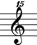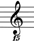 Ein oberhalb der zu spielenden Passage platziertes 15ma-Zeichen (=quindicesima alta) zeigt dem Spieler, dass diese zwei Oktaven höher gespielt werden soll. Ein unterhalb der zu spielenden Passage platziertes 15ma-Zeichen, alternativ in der modernen Musik auch ein 15mb (=quindicesima bassa), zeigt dem Spieler, dass diese zwei Oktaven tiefer gespielt werden soll. |