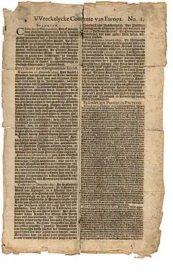 - ↑ Bild der ältesten gedruckten Zeitung, "Courante uyt Italien, Duytslandt, &c." ( des vom 4. August 2010 im Internet Archive) Info: Der Archivlink wurde automatisch eingesetzt und noch nicht geprüft. Bitte prüfe Original- und Archivlink gemäß Anleitung und entferne dann diesen Hinweis.. Koninklijke Bibliotheek, Den Haag